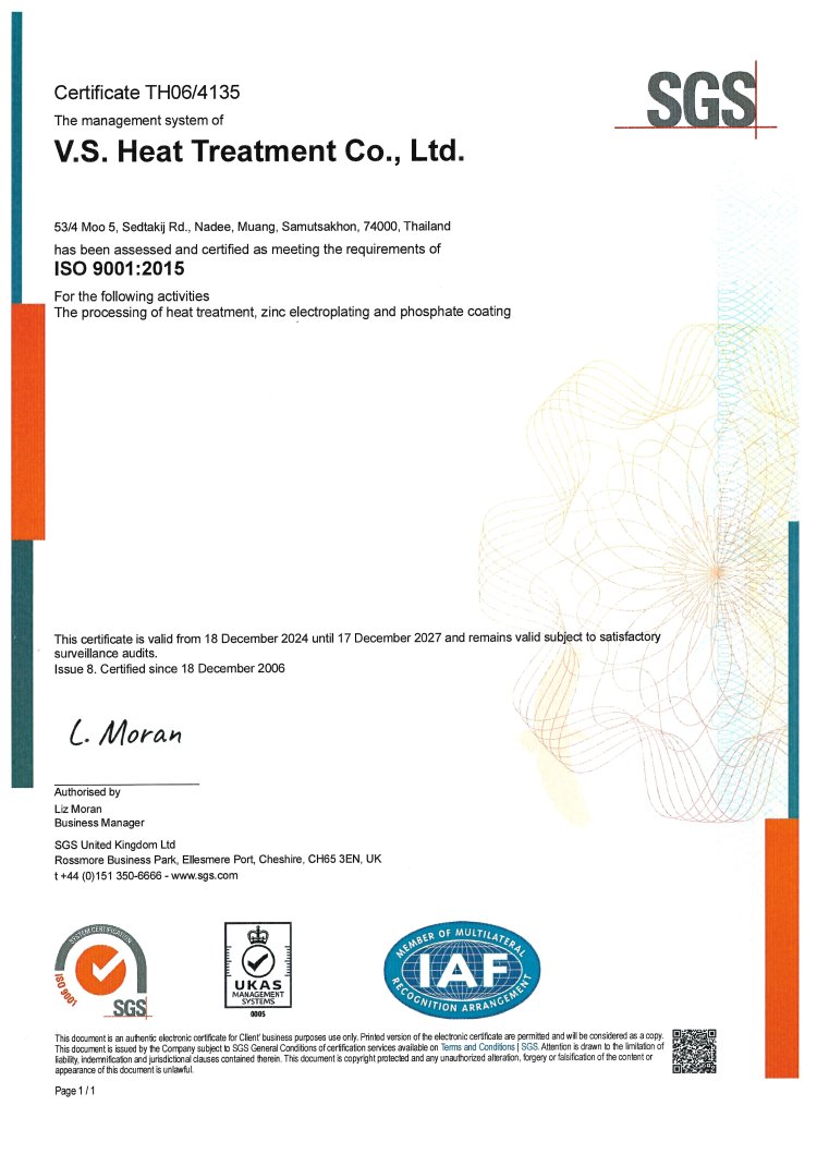 บริษัท วี.เอส.ฮีททรีทเม้นต์ จำกัด ก่อตั้งขึ้นเมื่อวันที่ 13 กรกฎาคม 2537 ด้วยทุนจดทะเบียน 50,000,000 บาท และได้รับการรับรองมาตราฐาน ISO 9001:2015 จาก บริษัท เอสจีเอส (ประเทศไทย) จำกัด